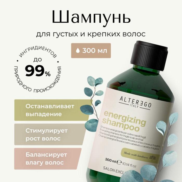 ALTER EGO Scalp Ritual Energizing Shampoo — энергетический шампунь против выпадения волос, который специально разработан для восстановления упругости и сопротивляемости слабых ломких волос, эффективно очищает и создает идеальные условия для оптимальной борьбы с выпадением волос. Содержит витамины B3, В5, экстракт пальмы. Не содержит сульфатов, парафинового воска, силиконов и синтетических красителей.